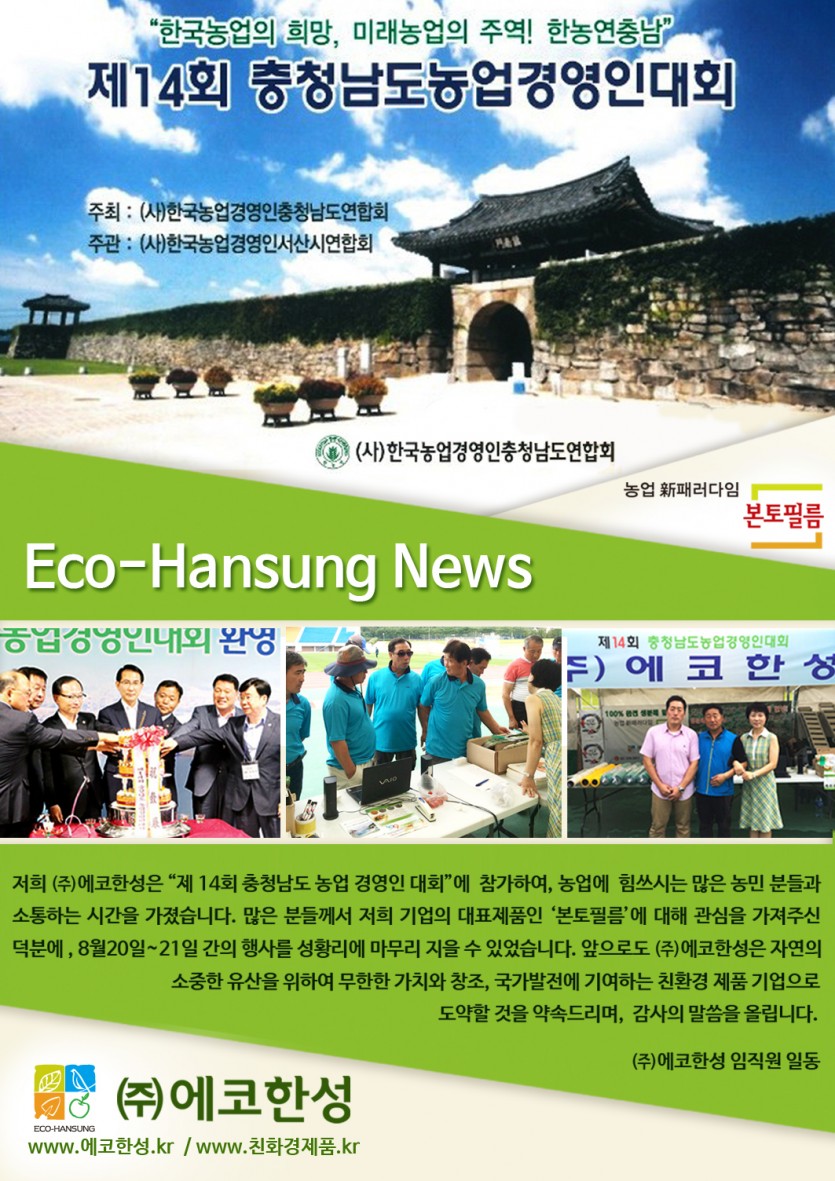 안녕하세요, 저희 ㈜에코한성은 '제14회 충청남도농업경영인대회'에 참가하여, 농업에 힘쓰시는 많은 농업인 분들과 소통하는 시간을 가졌습니다. 많은 분들께서 저희 기업의 대표제품인 '본토필름'에 대해 관심을 가져주신 덕분에, 8월 20일~21에 열린 행사를 성황리에 마무리 지을 수 있었습니다. 앞으로 ㈜에코한성은 자연의 소중한 유산을 위하여 무한한가치와 창조, 국가발전에 기여하는 친환경 제품기업으로 도약할 것을 약속드립니다.