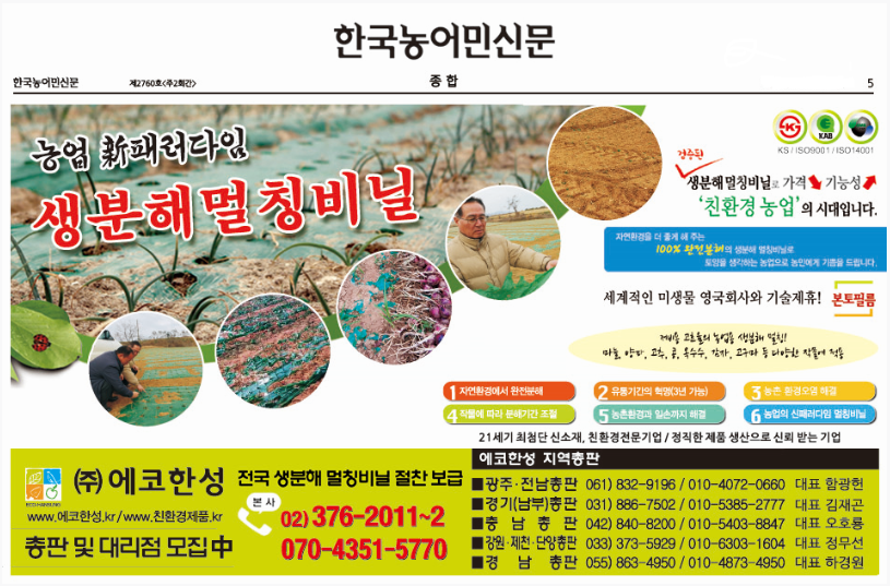 한국농어민신문을 애독하시는 많은 농업종사자분들께 저희 ㈜에코한성이 '본토필름'으로 2015년 10월13일자 5단광고