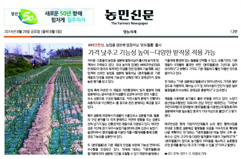 농민신문(2014.8.29) - 가격 낮추고 기능성 높여, 다양한 밭작물 적용 가능