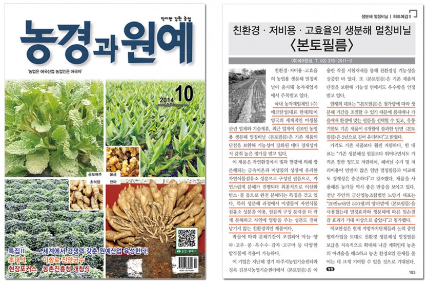 농경과 원예(2014.10월호) - 친환경·저비용·고효율의 생분해 멀칭비닐<본토필름>
