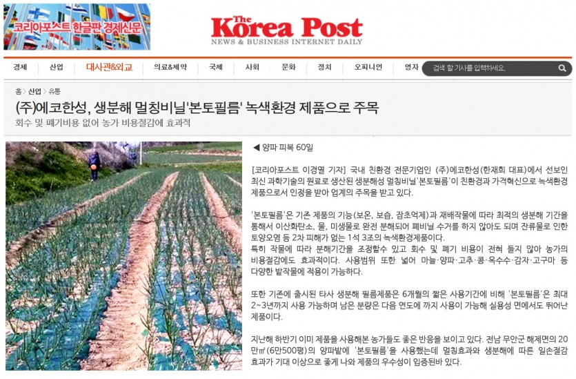 코리아 포스트(2015.03.09)- 언론기사 보도! , ㈜에코한성, 생분해 멀칭비닐'본토필름' 녹색환경 제품으로 주목
